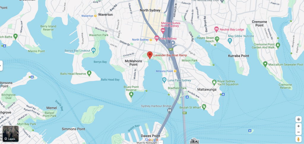 Let’s move on to our third favourite pick-up spot in the Lower North Shore – the lovely Lavender Bay Boat Ramp. This charming wharf is a go-to choice for small and mid-sized parties, conveniently located in North Sydney. However, the wharf lacks a covered waiting area. Therefore, for people who prefer to be out of the sun or who want to await pick-up in a comfy waiting room, one of Sydney’s public wharfs such as the North Sydney Wharf might be a better choice.